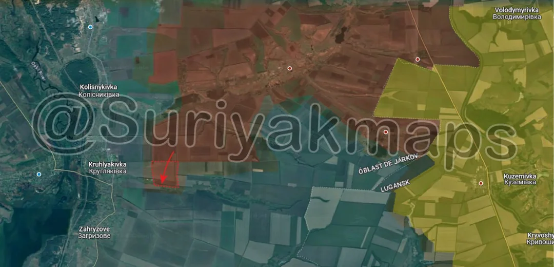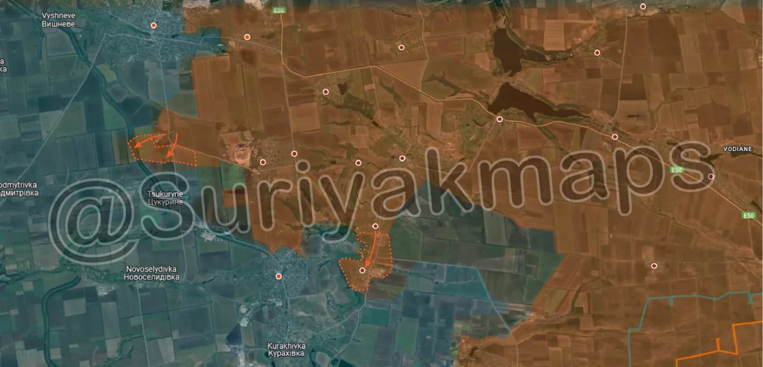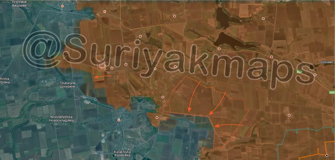 Following on from Picture 4, Russian advances continue across the Vuhledar front, with the final stages of the battle for the town in full swing. On the western side, Russian troops have captured most of the remaining fields north of Prechystivka (red dot under @), and have settled along the southern side of a small stream. They will likely not advance further north until Vuhledar is wrapped up, and/or preparation for an advance towards Novoukrainka (blue dot under @) is completed.