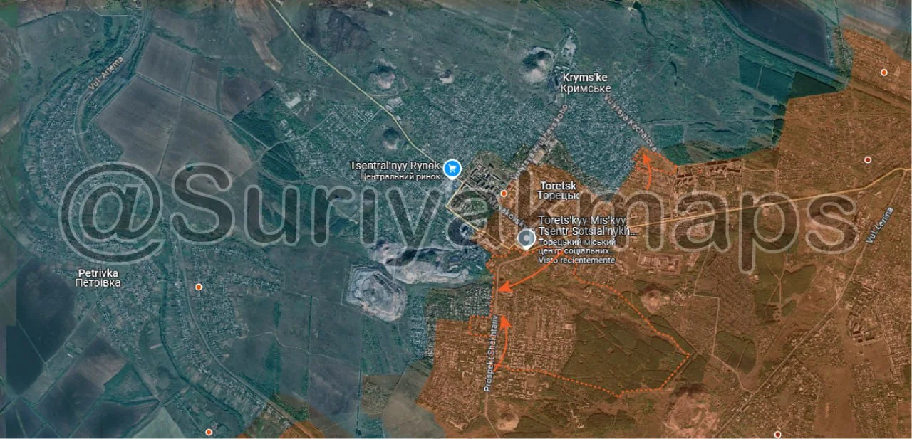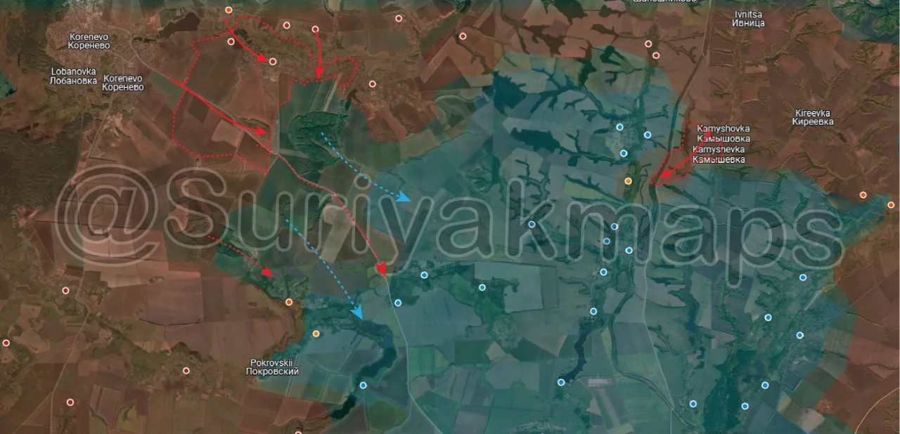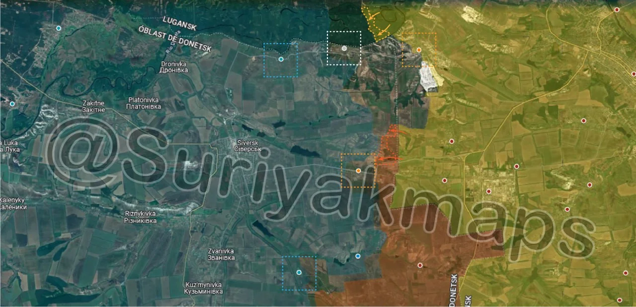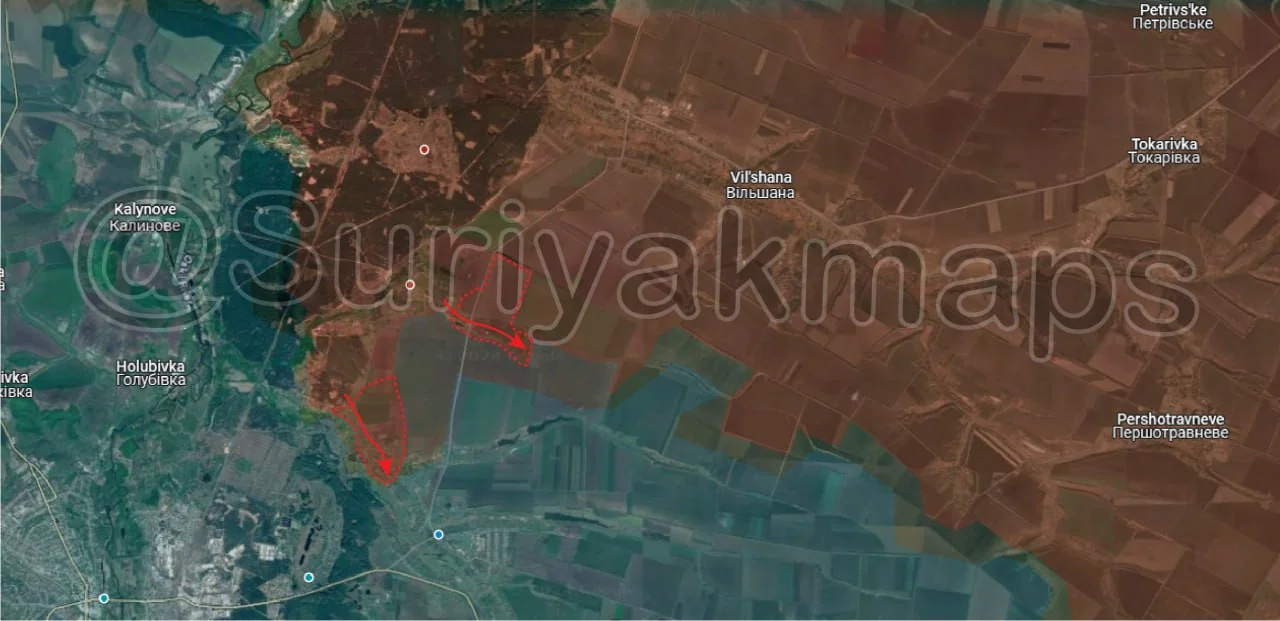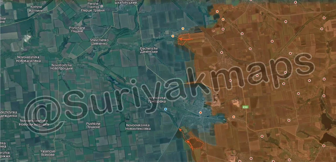 Whilst information and reports are scattered, what could be confirmed is that Russian troops were able to recapture Matveeka (red dot above S) and Olgovka (red dot above u), as well as a large portion of the fields in that area. Suriyak is being conservative with the rest of this area, at least until we get further confirmation, but Ukrainian troops have likely quickly retreated from the large forest area near Olgovka, as well as from most of the fields near the main road until Zelenyi Shylakh (blue dot below y), pulling back to friendly positions around the villages.