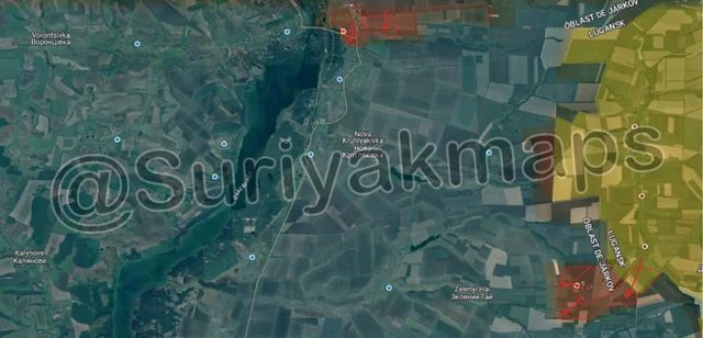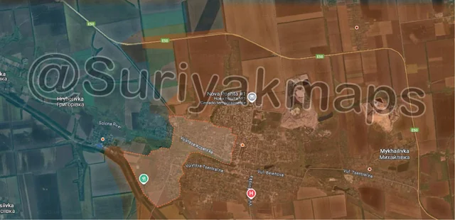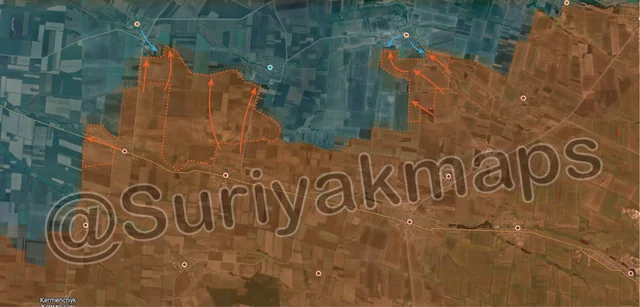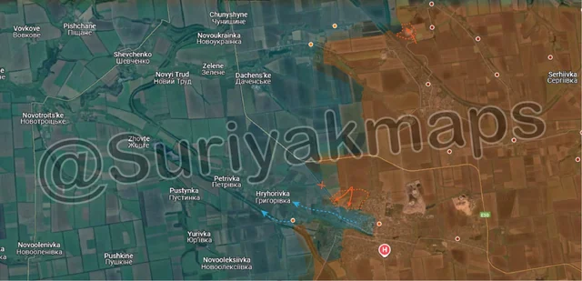 Starting with the west (left) side, building on their success in Picture 4, Russian troops launched more mechanised assaults, advancing slightly west of Zolota Nyva (red dot above S), but primarily capturing a significant area of fields south of Shakhtarske (top left red dot) and Novoukrainka (top middle blue dot). These advances happened very quickly, with Russian troops overrunning multiple Ukrainian positions with few losses and reaching the outskirts of both towns. Clashes are currently ongoing in both Shakhtarske and Novoukrainka, as Ukraine desperately tries to hold the settlements.