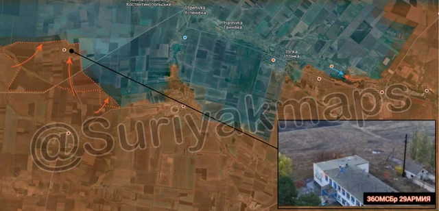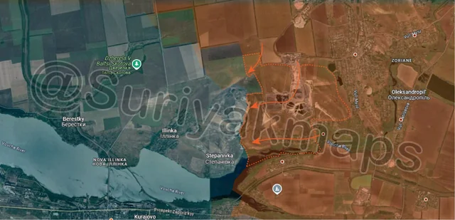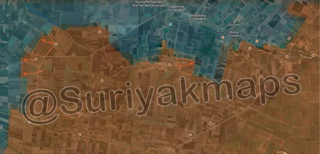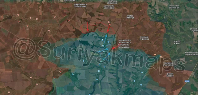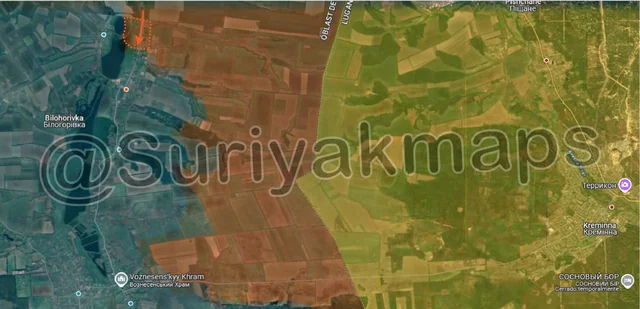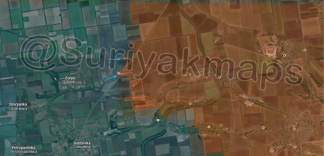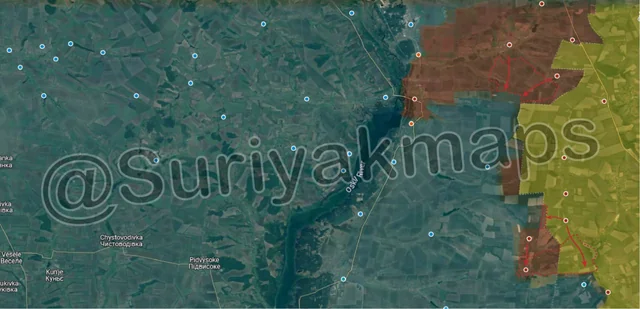 On the Oskil River front, Russian forces continue their advances in multiple areas. On the north side, Russia cleared and captured the fields and trenches south of Pishchane that I mentioned in the previous post, meaning the village now has a large buffer around it. This will aid Russia in being able to move its forces all the way to Kruhlyakivka (above the m) to take part in the battles along the Oskil River, with less risk of being attacked on the way.