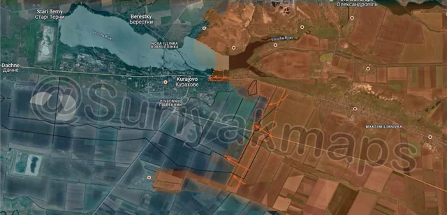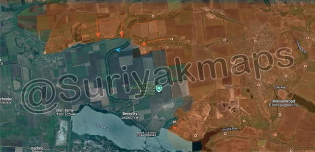 On the Kurakhove front, the strategic situation continues to deteriorate for Ukraine. On top of Russia breaking into Sontsivka (above the @) the day before, Ukraine has now also lost control of Novoselydivka (above the a) and Voznesenka (above the i). This means Russia now only has open fields between their current positions, and Stari Terny and Berestky. These fields do have some trench networks built, but they are near the reservoir itself, and were designed to defend against attacks from the south or east. With Russia moving in from the north, by the time these trench networks can be used for defence they will have fire control over the last supply road in the area, meaning holding them is pointless. On another note, Ukraine allegedly tried to destroy the Kurakhovskaya dam, or at least the road on top of the dam, in what is likely a move to try hinder/slow down the Russian advance north of the reservoir. This will be effective, but it also signals that Ukraine has all but given up on the notion they can control the northern area, as they have now made it extremely difficult to get vehicles into, or evacuate vehicles from, that region.