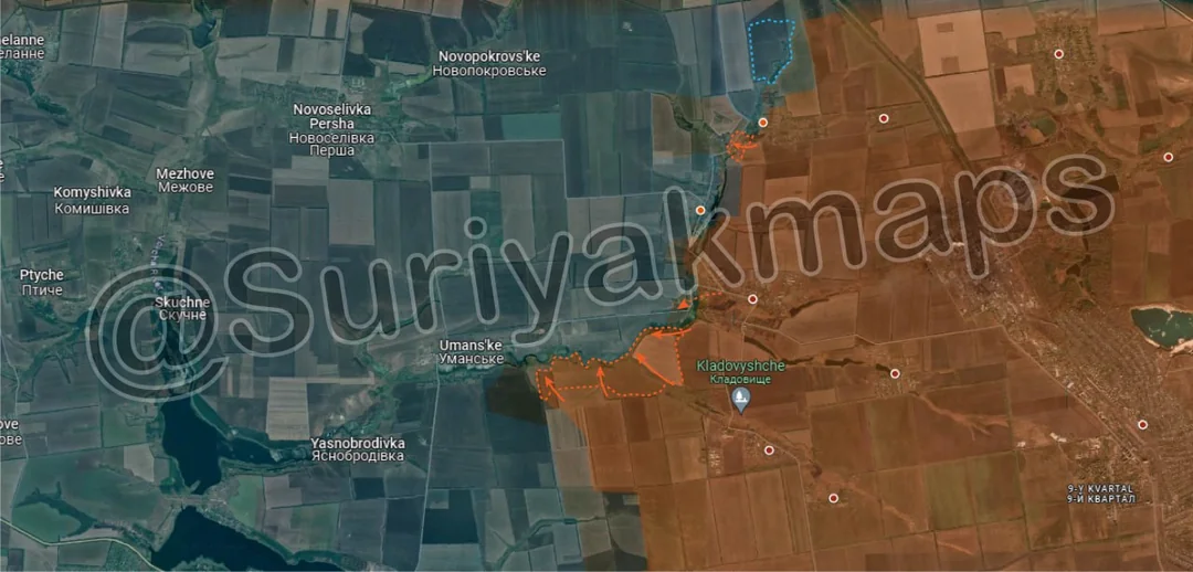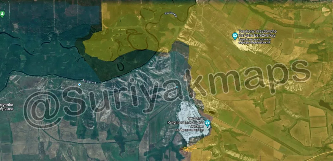 The situation for the first Ukrainian defence line has become critical. Not only has Russia crossed the river to the south of Semenivka, but now it has also managed to cross in the north in Berdychi, occupying the houses. This will allow Russia to assault Ukrainian positions in Semenivka from both the south and the north. Ukraine managed to retain control of the fields next to the river north of Berdychi (blue outline), however this does not stop Russia's advances in the other areas. Russia has also advanced right up to the defence line (the river) in the fields near Tonenke as well, which will enable them to attempt breaching the line in this area too.