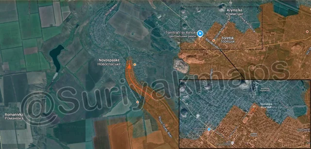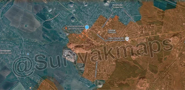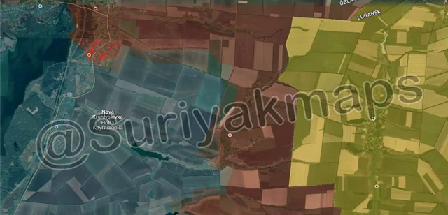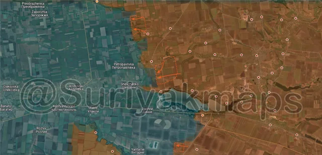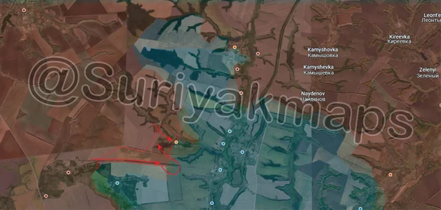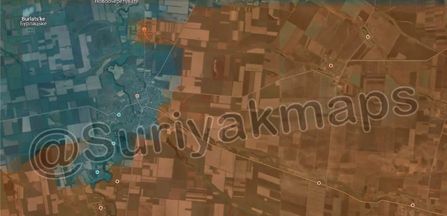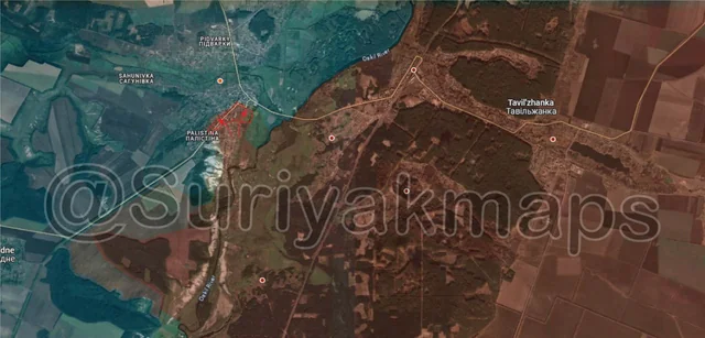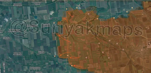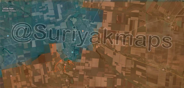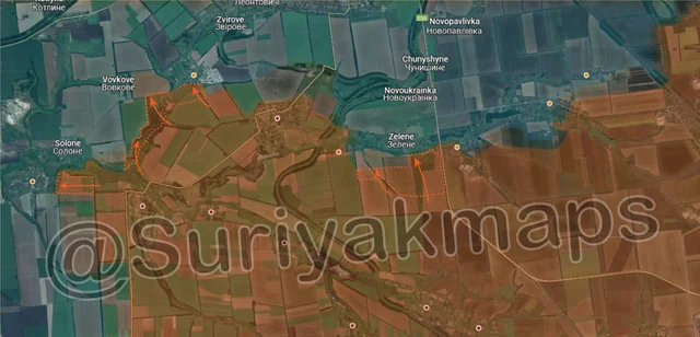 Back onto the Velyka Novosilka front, this time to the south. Over the past few days Russian troops have continued to advance from the south, capturing the village of Storozheve (mentioned last post), as well as the surrounding fields and trenches. A separate Russian group also pushed north, capturing another field and treeline, putting Russia only 1 field away from cutting the last Ukrainian supply road (although some Russian sources claim this has already happened). With Storozheve under control, Russia can move onto Neskuchne (bottom blue dot), which is connected to Vremivka and then Velyka Novosilka.