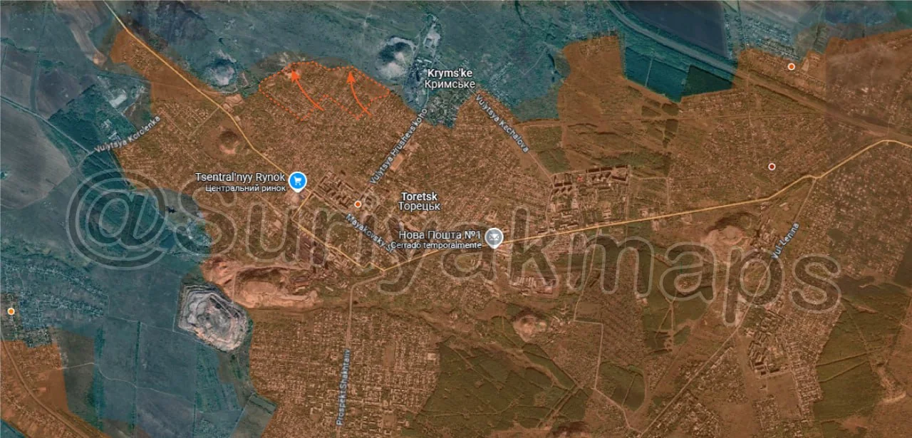 Following on from picture 5, starting with the north side, Russia captured the chalk quarry and took up positions in the treeline to the west of it. There is a Ukrainian trench network about 400m west of here, which covers the southern side of Udachne. Russia may choose to just ignore this however, and use the treeline next to the quarry to head straight north to the railway line (not defence between the quarry and railway).