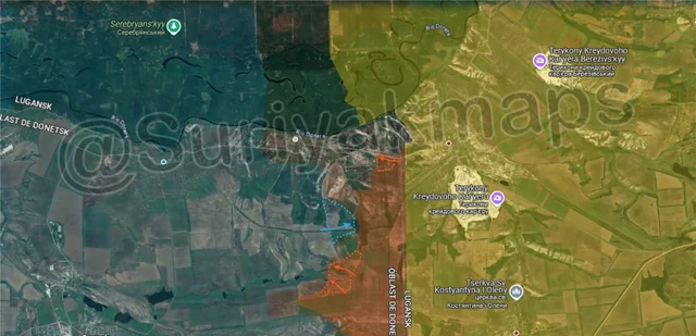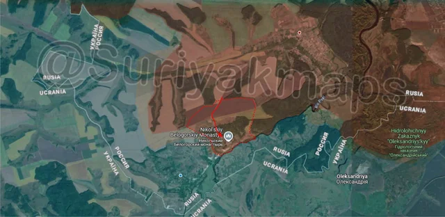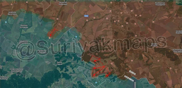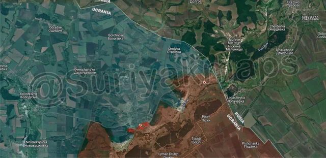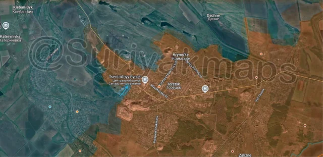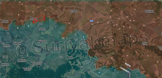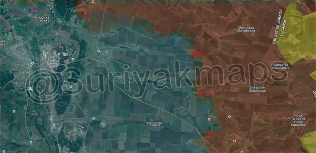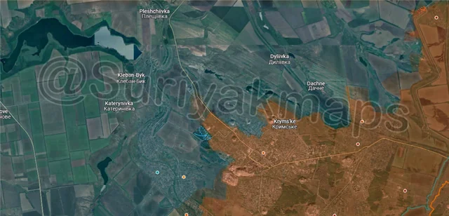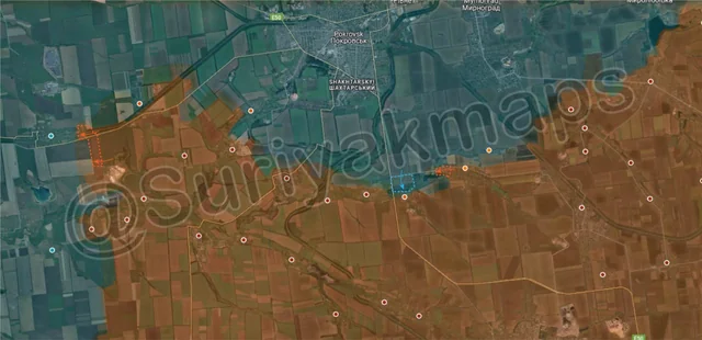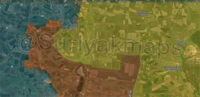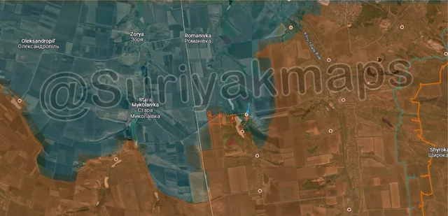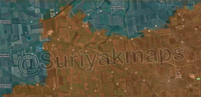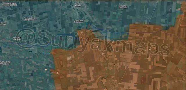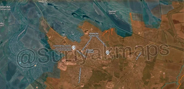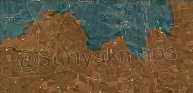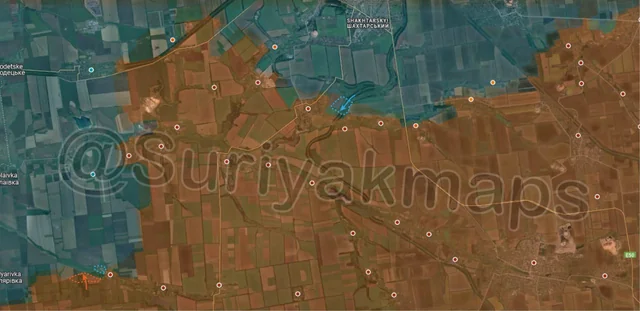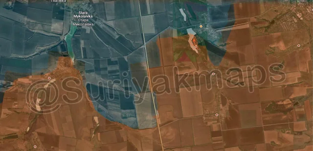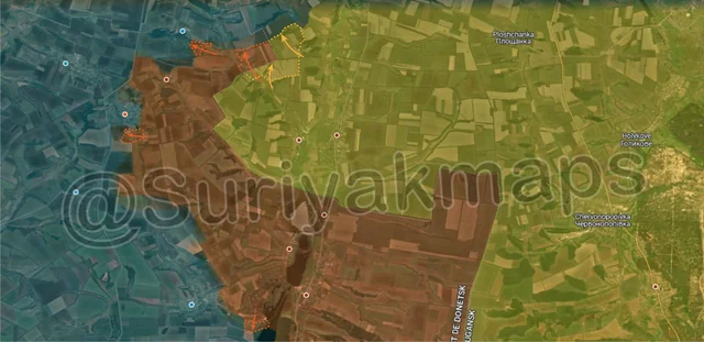 Following on from picture 3, Russian forces decided not to wait for their flanking attacks to complete, and have hit Valentynivka head on from Panteleimonivka. These assault groups rapidly overwhelmed the Ukrainian defenders, capturing the outer trenches before quickly taking over most of the village. They’ve also joined up with the Russian group/s operating in the fields west (mentioned in picture 3) and have advanced west of the reservoir, taking over some treelines and forest areas. Ukraine’s troops have fallen back into central Sukha Balka, but they are in a dire situation, as they have lost a lot of their forces over the past few weeks of Russian attacks and are about to be cut off from their only supply road. If Ukrainian command has not already ordered a retreat, they should be leaving immediately via the fields and treelines north, as staying would only lead to a full encirclement or being wiped out.
