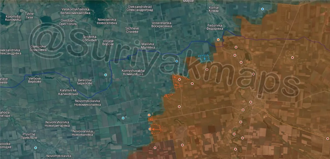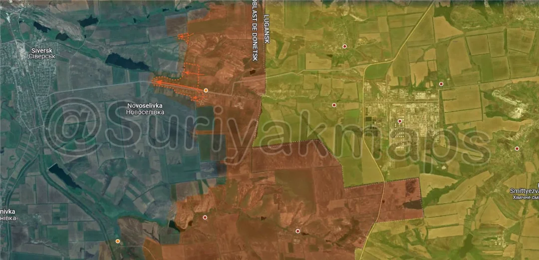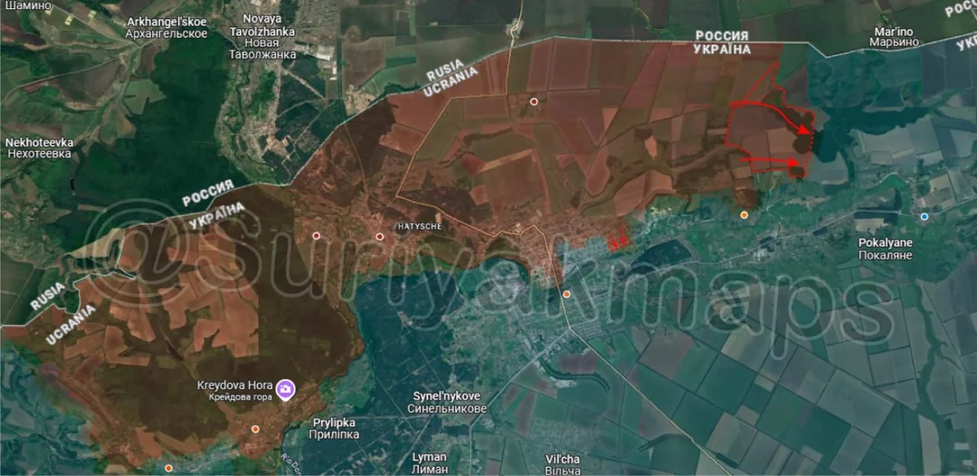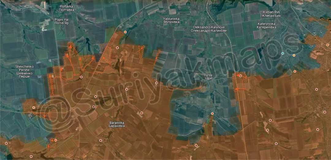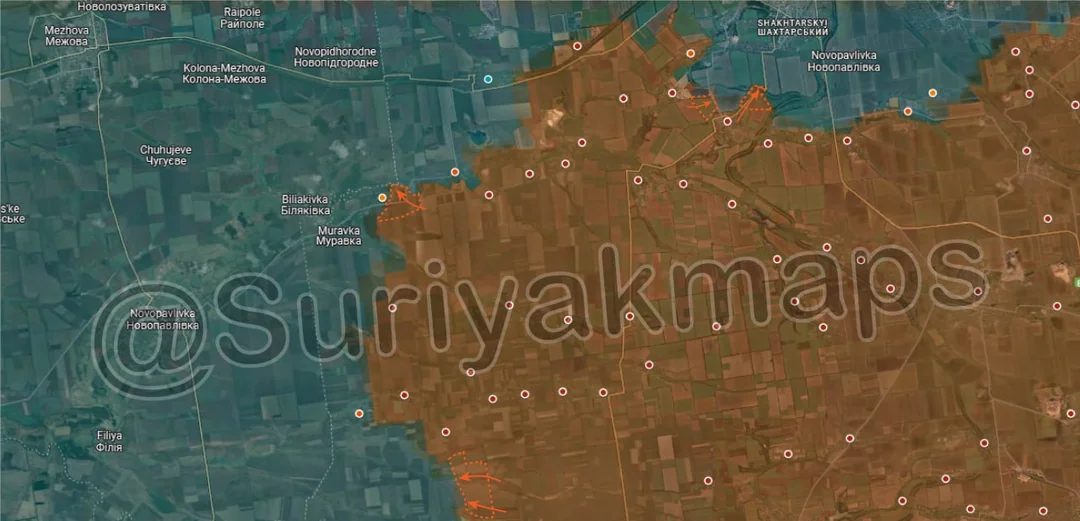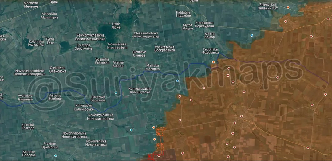 Going west again, Russian assault groups made significant advances all around Nova Poltavka and Novoolenivka, capturing the remainder of the fields east of the highway, a number of livestock farms, several fortifications, and many treelines and fields. After Nova Poltavka fell the surviving Ukrainian troops retreated all the way back north to Poltavka and Popiv Yar, and have so far been unable to reestablish a defence line. At the current rate of advance Russia will reach those settlements within a week, leaving the Ukrainian garrison little time to prepare and reorganise.