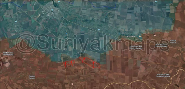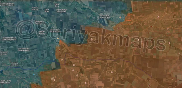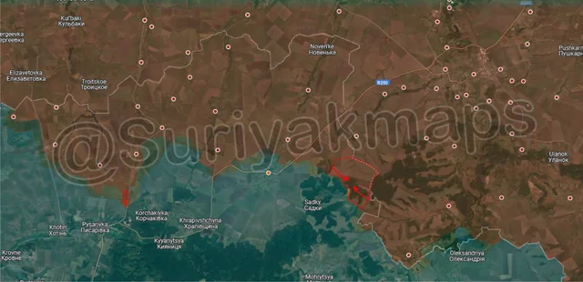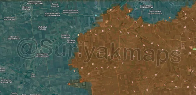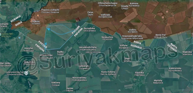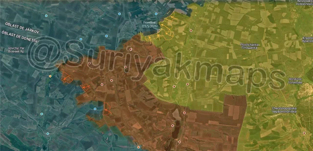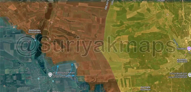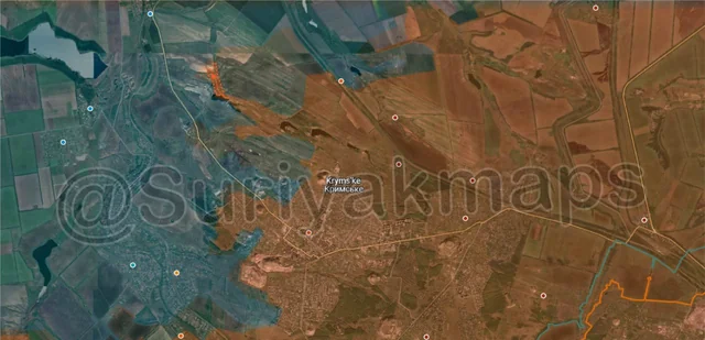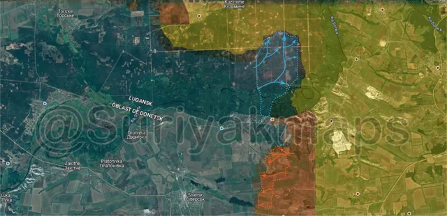 On the same front, southeast of the previous picture, Suriyak has made a perplexing change in the control in the Serebryansky forest, claiming that Ukraine has been on the attack here since the end of May. As to why I am confused, one of the drone videos that allegedly showed Ukrainian progress here (specifically the northern part of this advance) was retracted after the account that geolocated it admitted it was incorrect (they were actually several km further south). Additionally, Suriyak has had a large chunk of the forest as greyzone for over a year now, when many other mappers, including Russian ones, have said this area (the southern and eastern side of this advance), has been under Ukrainian control for a while. So it would be more accurate to say this is a long overdue correction with an incorrectly geolocated advance on top of it. However, even if overdue it’s still a territorial change, so it gets included.