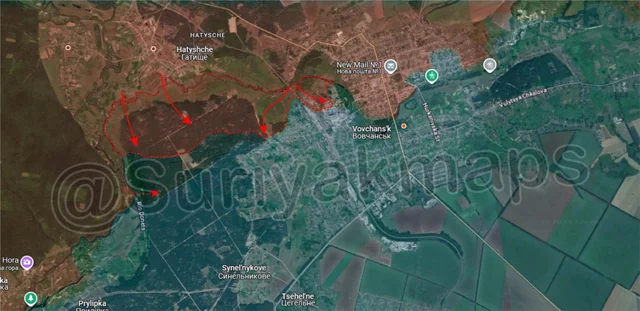 To the southeast, Ukraine crossed back over the Vovcha River with a small number of infantry, pushing back into and recapturing the small village of Yalta. The Russians do not looks to have had a garrison present in Yalta at all, with most of their troops preoccupied with the push west, leaving the opening for Ukraine to exploit. Ukraine is unlikely to be able to hold Yalta for long, as Russia will be able to bomb/drone the few troops there and force a retreat, before sending in an assault group, but it does waste their time.