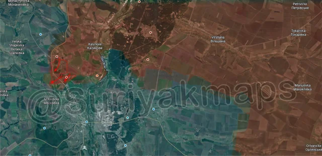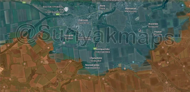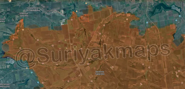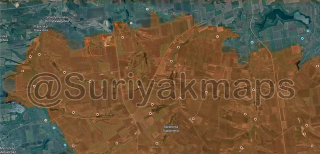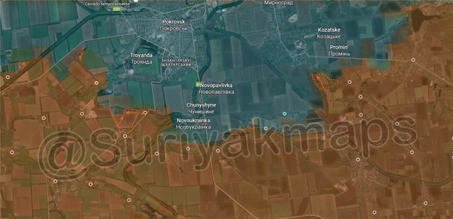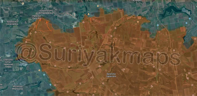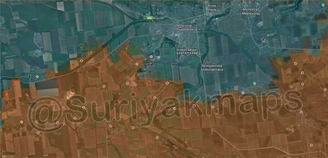 Now is also a good time to mention that Russian DRGs and small infantry groups have allegedly made a localised breakthrough to the northeast of Pokrovsk. Both Russian and Ukrainian sources are reporting Russian troops quickly spreading out and pushing into Nykanorivka, Pankivka, Mayak, Volodymyrivka (see above), and Zatyshok. It is also being reported that some groups have made it as far as the road between Nove Shakhove and Shakhove, cutting it off. As for why such gains aren’t shown here, Suriyak is doing as he usually does and being cautious/conservative until more evidence is released. There is always the chance that these gains are exaggerated or Russian troops fail to consolidate positions, so until more footage/proof is released he will likely not show the full extent of the reported advance.