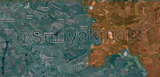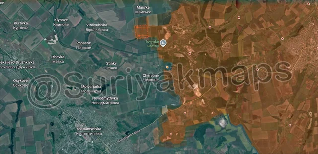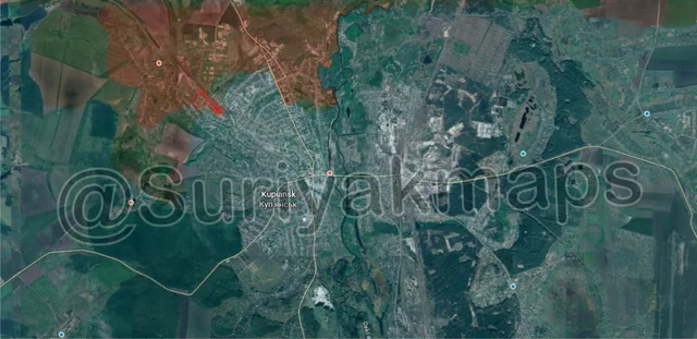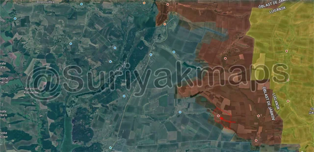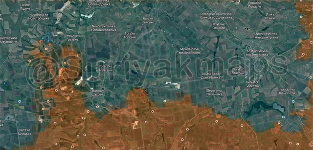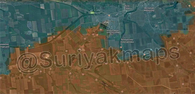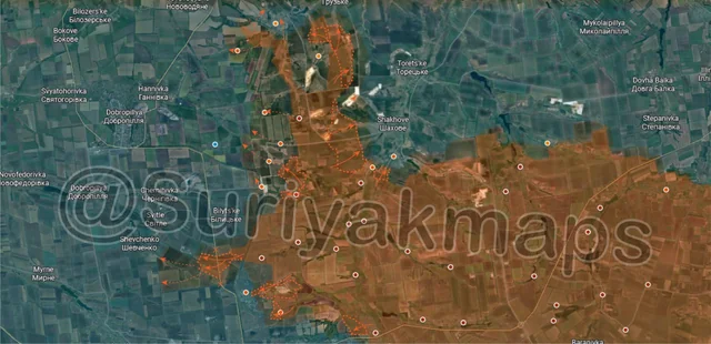 To the south, the centre of the spearhead was expanded, with Russia taking control over the remainder on Nykanorivka and adjacent forest area (middle left), whilst seizing more fields and treelines near Shakhove (middle right). Nearby, a Russian assault group entered Volodymyrivka, as they begin their second attempt to take the village.
