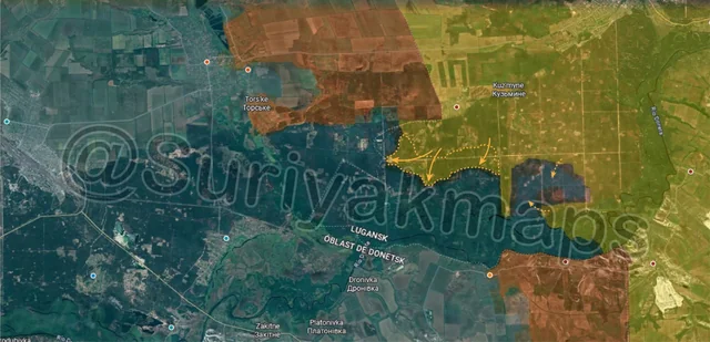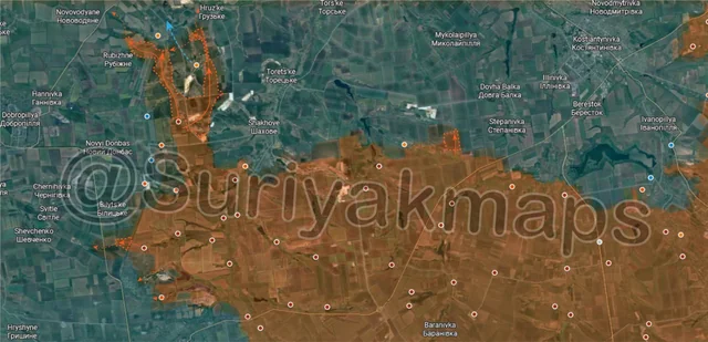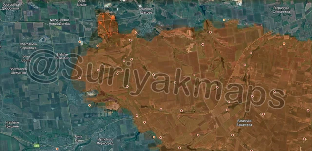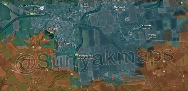 A little to the southeast, another set of Russian assaults groups has begun their assault on the mine east of Myrnohrad, moving up the treelines from Novoekonomichne. They have secured a foothold and are clashing with the Ukrainians are they try to capture the entire mine complex.