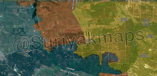Following on from the previous picture, Russian infantry groups have been moving into space created by the DRGs and are now securing and entrenching themselves in several areas. The greyzone has been significantly expanded as Russian DRGs have moved in or around Rubizhne, Vilne, Nove Shakhove and Ivanivka. As for Zolotyi Kolodyaz, it’s a mess with some sources claiming it is Russian controlled whilst others say that Russia never managed to entrench there (only DRGs passing through).