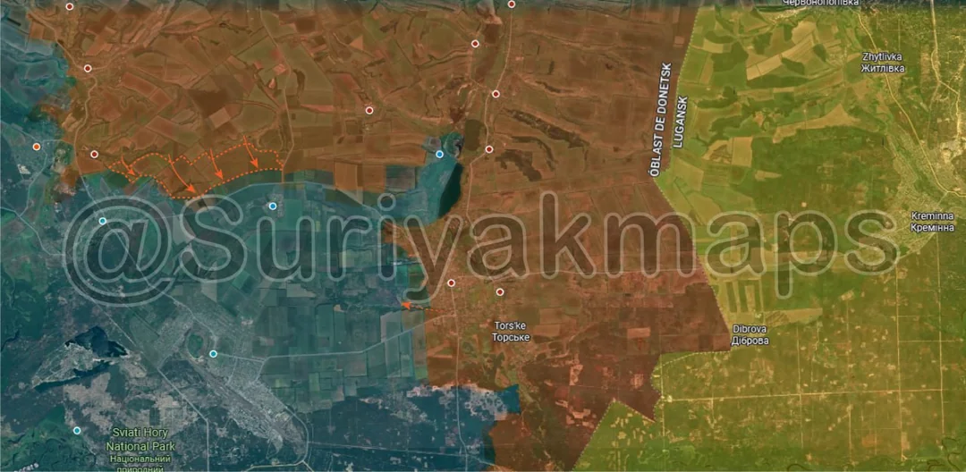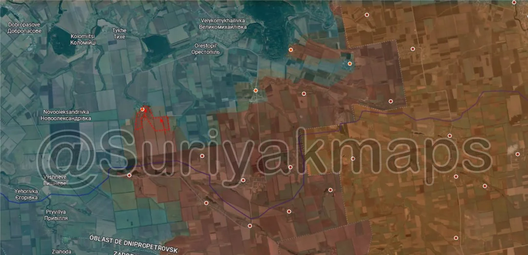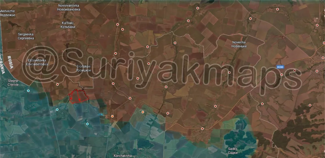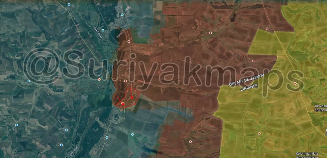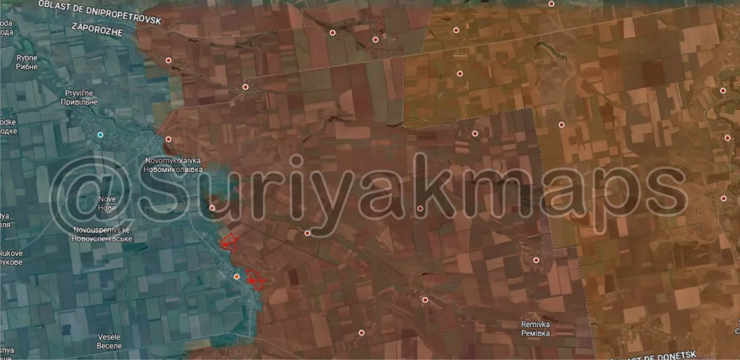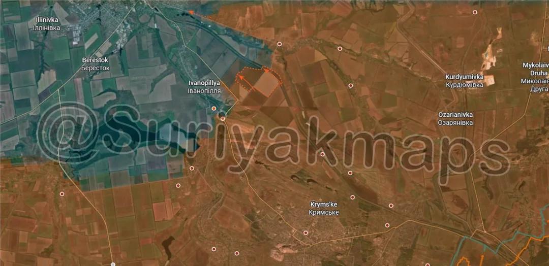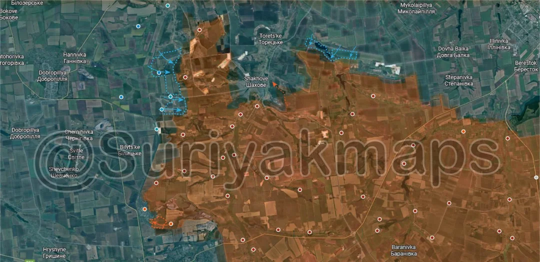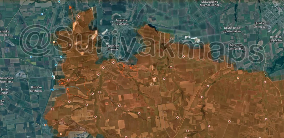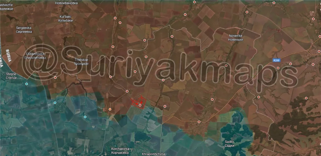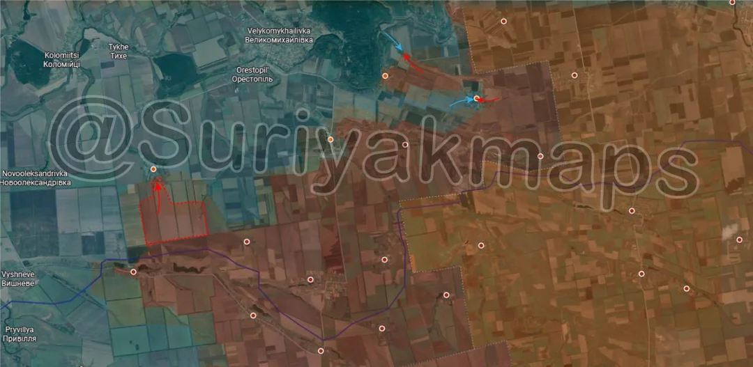 Adjacent to this, the Russians once again captured some of the trenches outside Novoekonomichne and re-entered Kapitalna Mine (above the k), whilst a little to the south Russian infantry groups moved back into the treelines around the small reservoir and entered the village of Balahan (under the a).