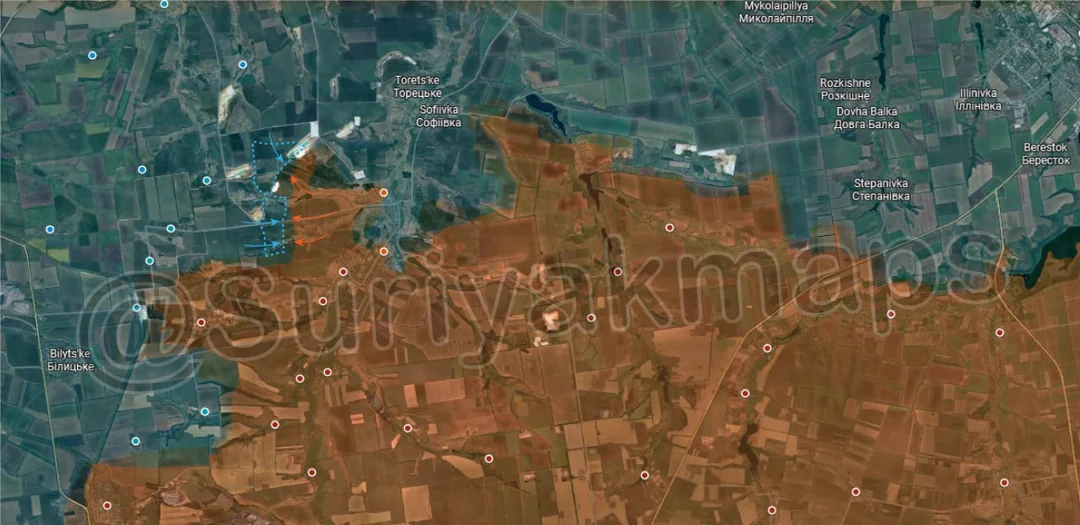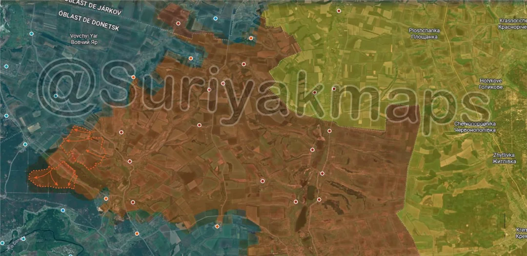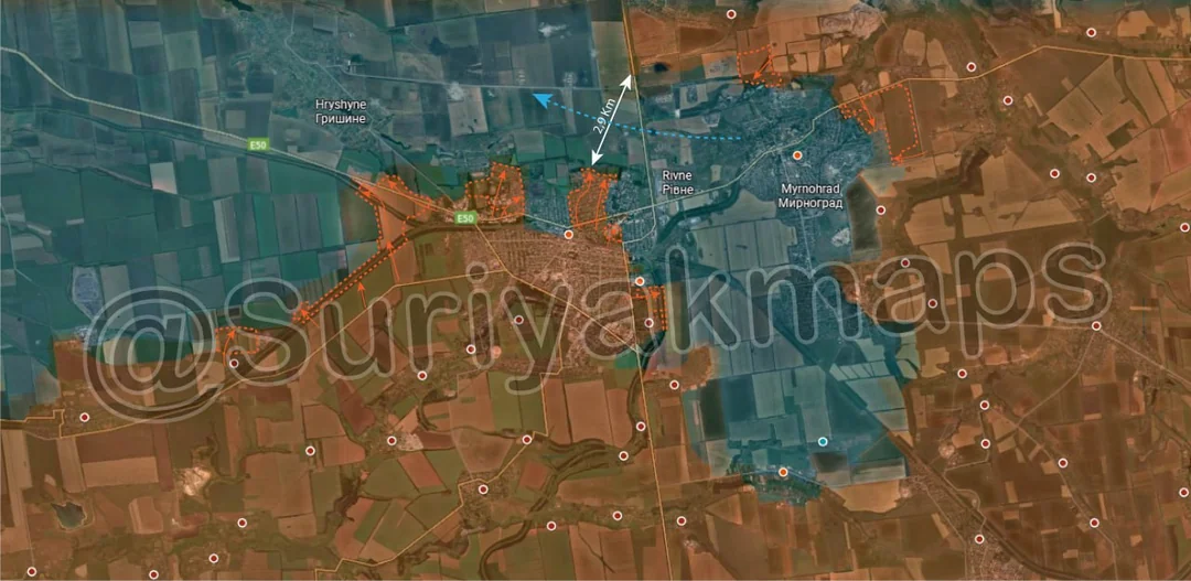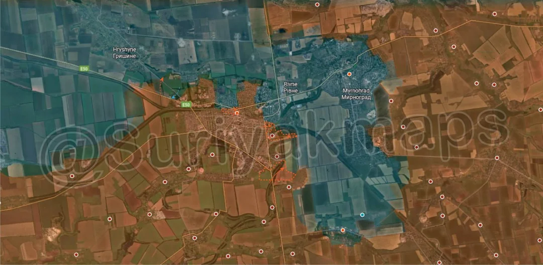 Following on from picture 8, in central Pokrovsk, Russia captured more buildings north of the railway, as well as securing the remainder of Rih (under the a) and some of the empty areas further south.