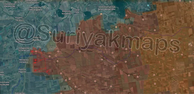 Moving east again, Russian forces made some more smaller advances in Myrnohrad, reaching the apartment blocks on the south side. The encircled Ukrainian troops are slowly running out of room and are being picked off by Russian drones or FABs that relentlessly hit their positions.