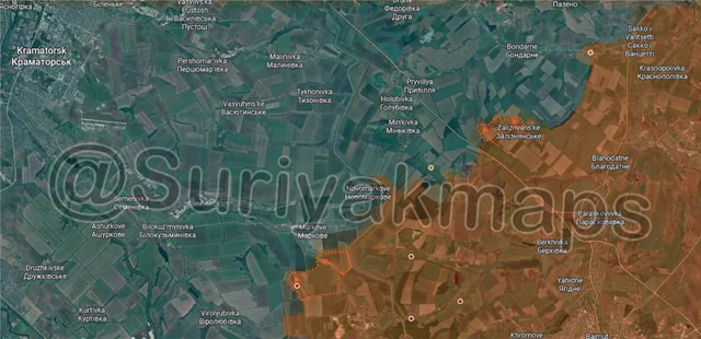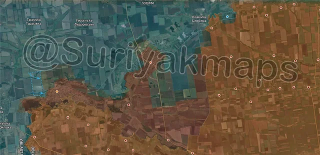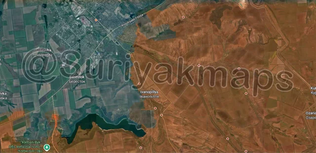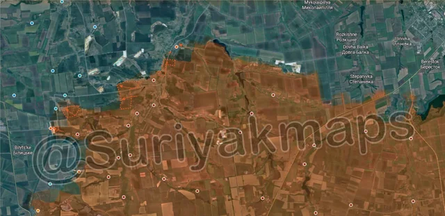 To the south, Russian forces have continued to make quick progress in clearing the area east of the Haichur River, capturing a large area of fields and treelines stretching all the way from Nove Zaporizhzhya down to Zelene, as well as entering the first houses of the village of Dobropillya (dot next to i). As I’ve mentioned a few times before, Ukraine is in full retreat across this front and is pulling back behind the Haichur River to their fortification line or to Hulyaipole, both of which have reportedly been reinforced.