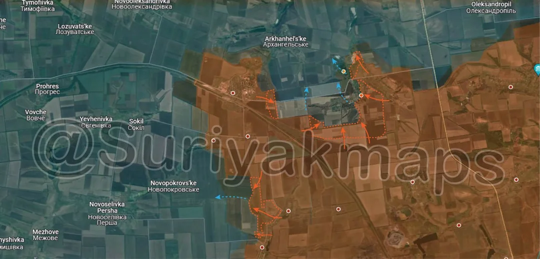 Following on from yesterday, Ukraine continues to retreat around Ocheretyne, as its troops struggle to contain the situation and pull back to avoid being cut off. As mentioned previously, Ukrainian forces in Keramik and Novokalynove were under threat of encirclement from the Russian advances out of Ocheretyne and along the eastern hills of Novokalynove. I said that they were almost certainly going to retreat due to the risk of encirclement, which has now been shown to be true, as Ukrainian forces have all but abandoned Novokalynove and Kermik, pulling back towards Arkhanhelske, Kalynove, and the various rivers and reservoirs to the north. Russia will likely continue to advance north, chasing the retreating Ukrainian units.