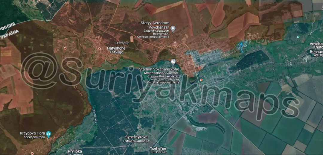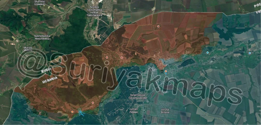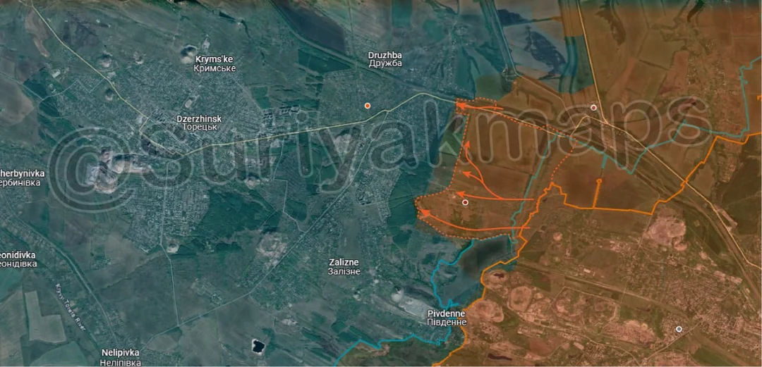 Russian forces made large gains on the Toretsk front, capturing a number of Ukrainian defences, which have been there for over a decade. I was initially sceptical of Russian claims of great success in this area, as its not the first time they have claimed to have breached the 2014 line, but recent footage and photos has shown it to be true. Russia was able to easily push forward, suffering minimal casualties due to little Ukrainian resistance, and are rapidly approaching the east side of Pivnichne (red dot below Druzhba).