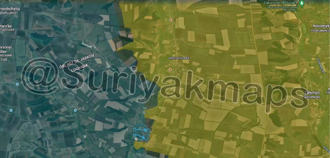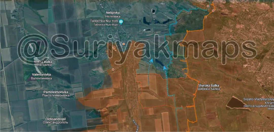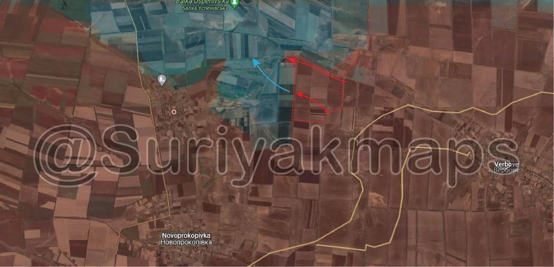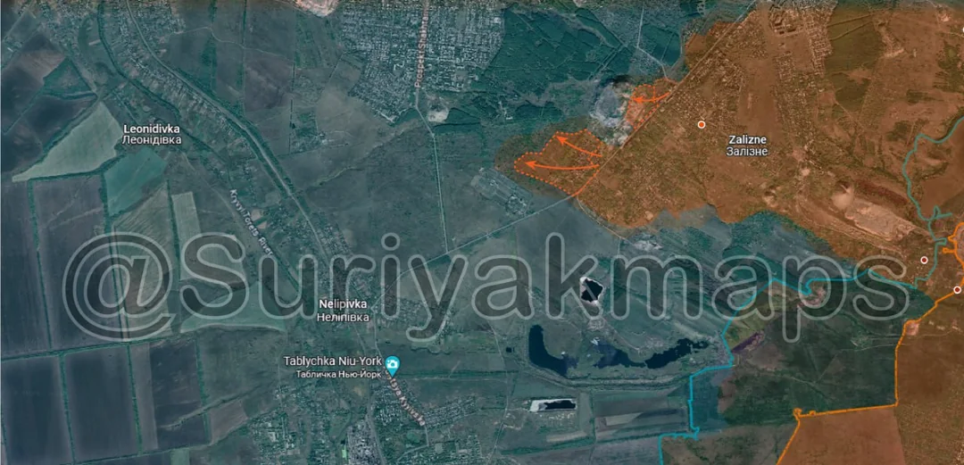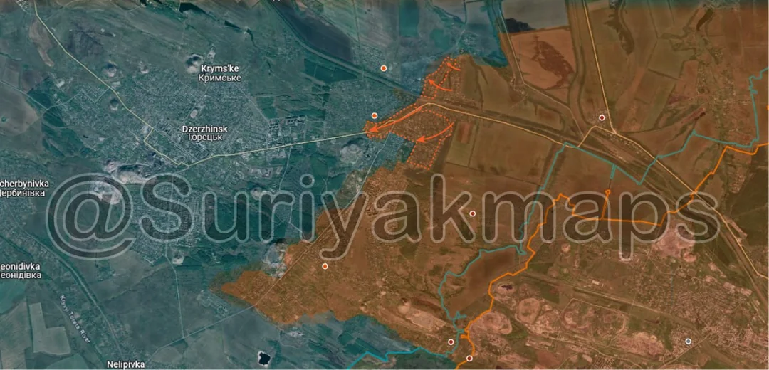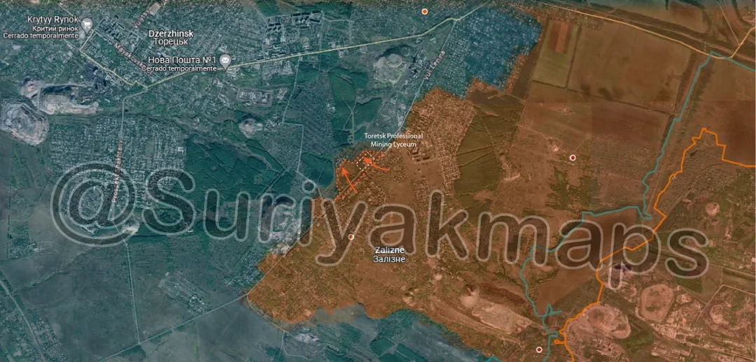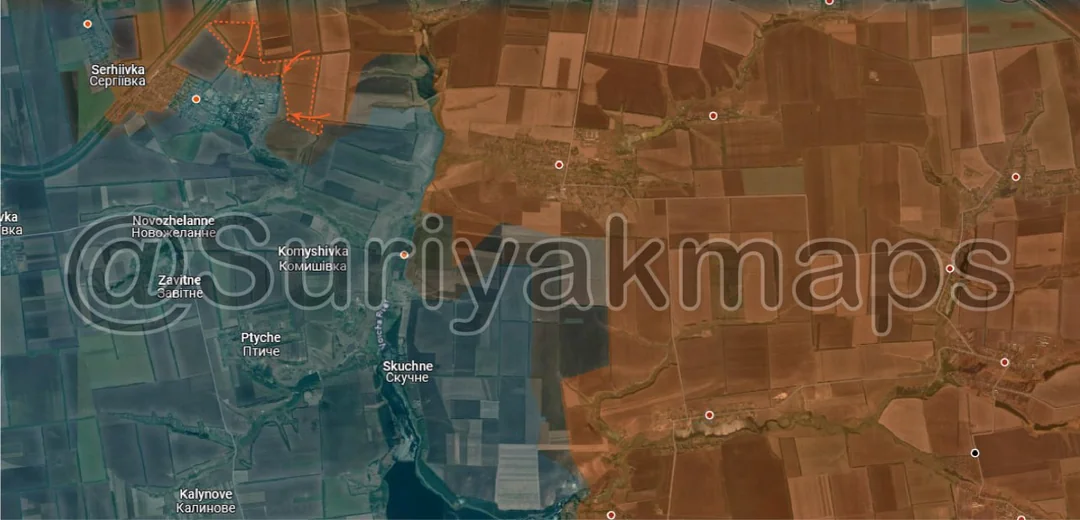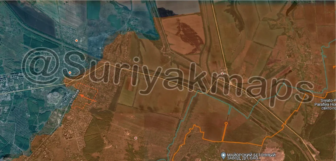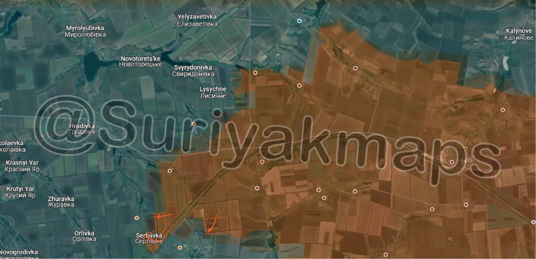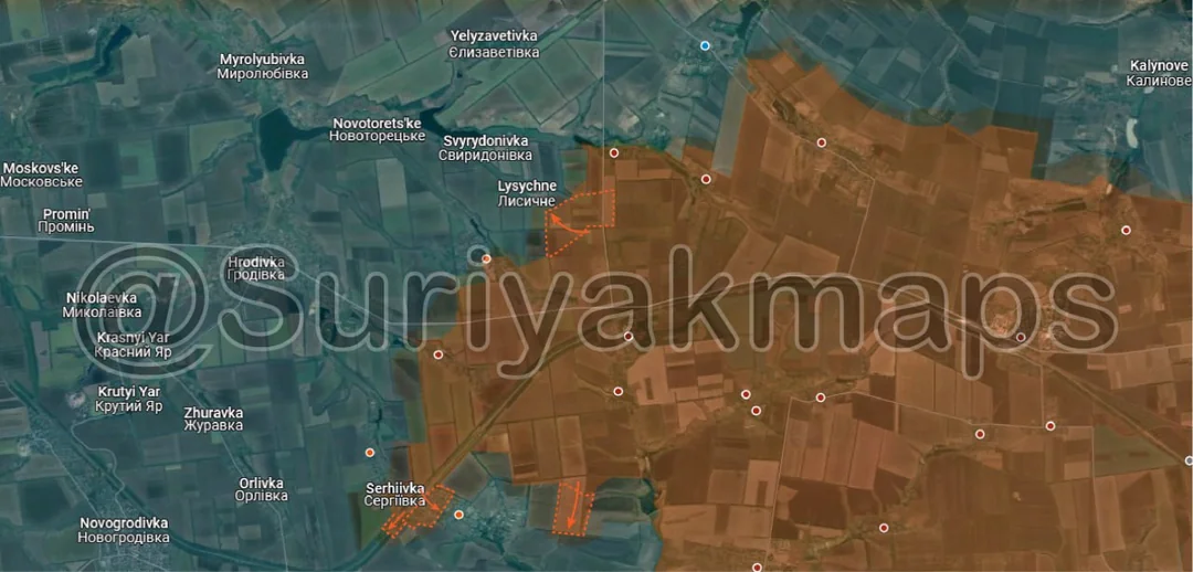 (Picture 1) Developments around Prohres continue. Russian forces pushed slightly further down the railway next to Serhiivka, as well as capturing the first houses of the village. This advance was opportunistic, as Russian focus is still primarily on Zhelanne (bottom red dot). Russian forces probably sent a small squad of infantry to clear the initial houses, and defend from attacks from the rear, as the main force prepares to assault the western side of Zhelanne.