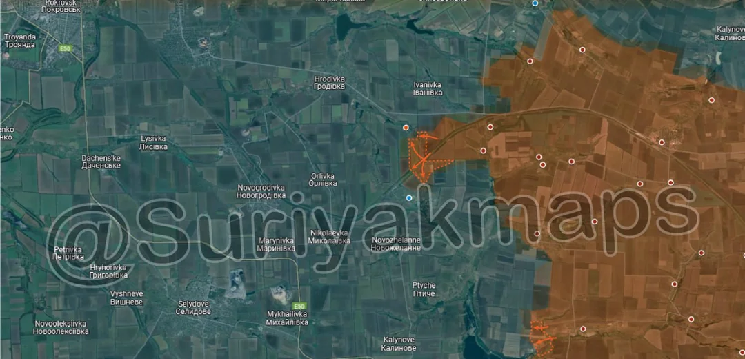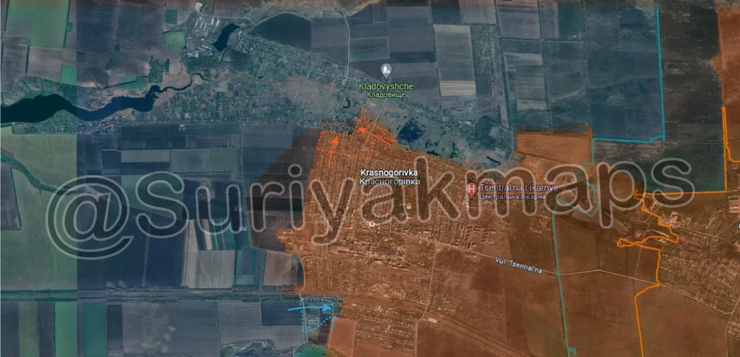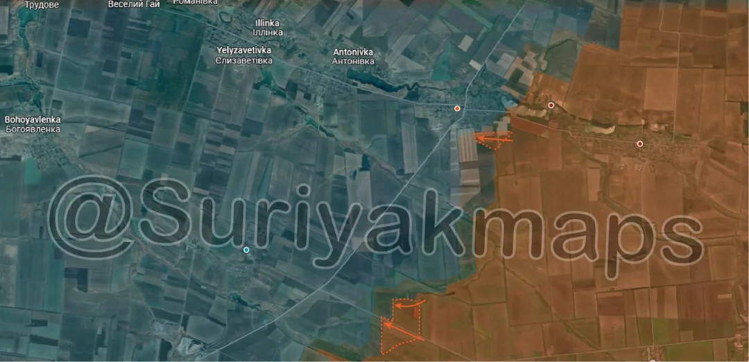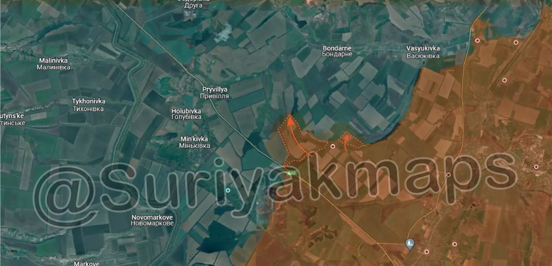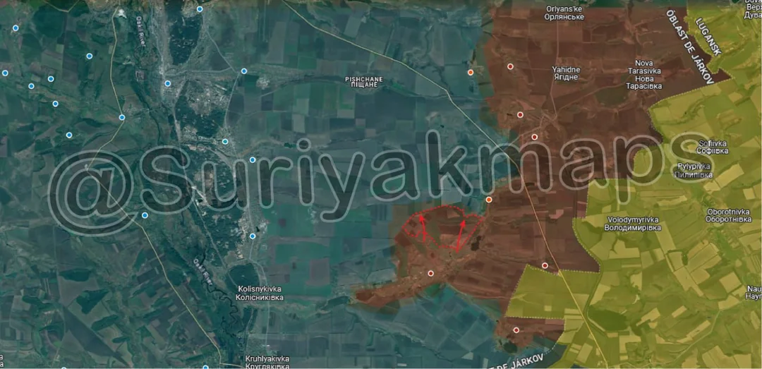 Following on from yesterday's update, Russian forces continued their push north of Pishchane, capturing another small trench network (close to the one from yesterday), as well as a number of fields and treelines. Russian forces in this area are exploiting the weak/unresponsive Ukrainian forces here, and are wrapping around behind their positions. From here, Russia can either continue advancing behind Ukraine's defence positions near Kyslivka (red dot above m), or start moving west across a broad front).