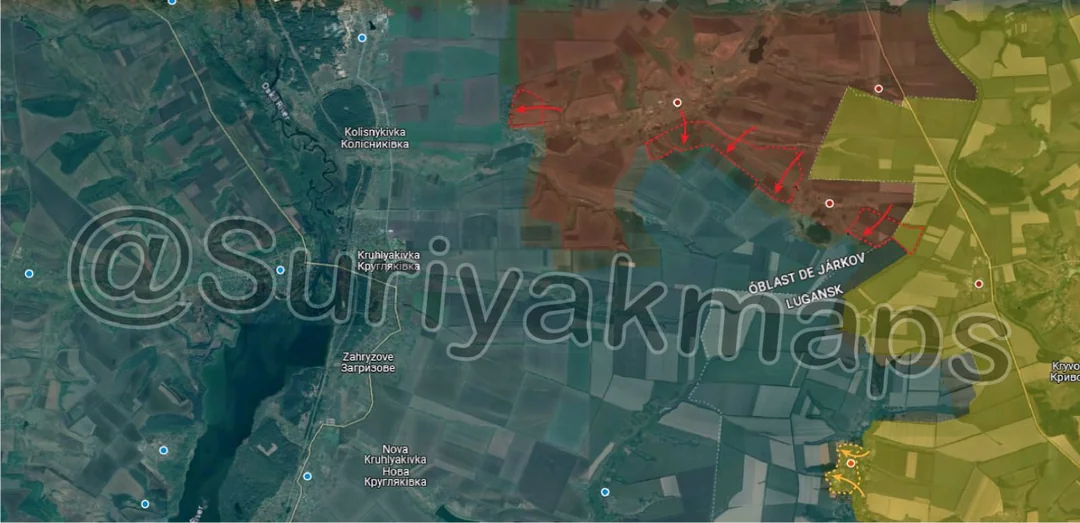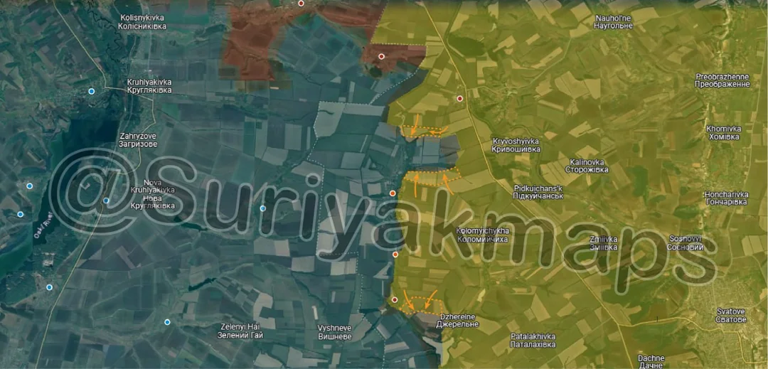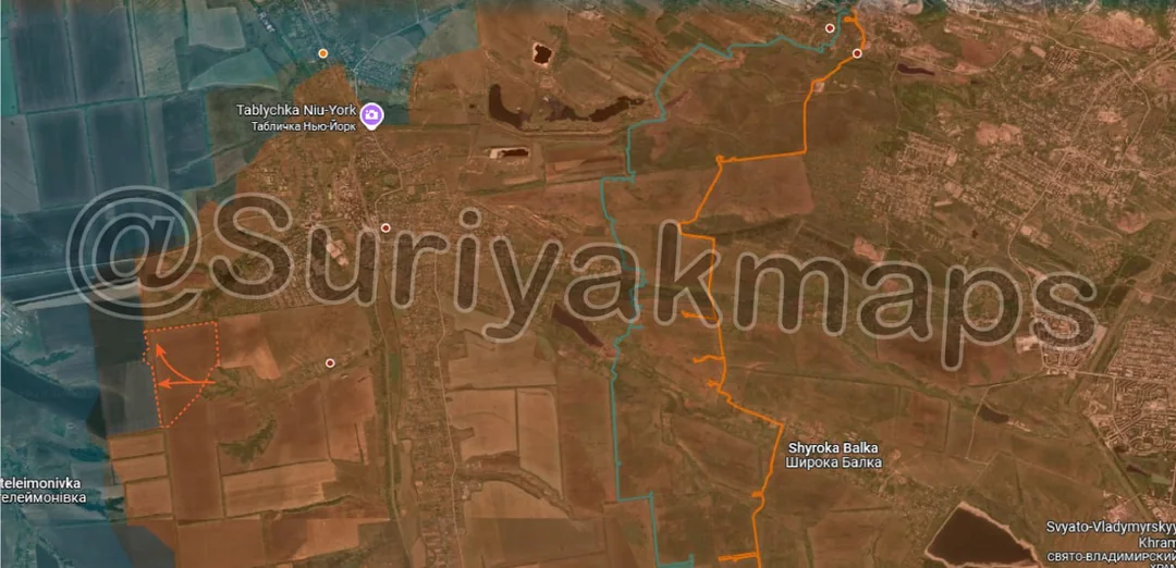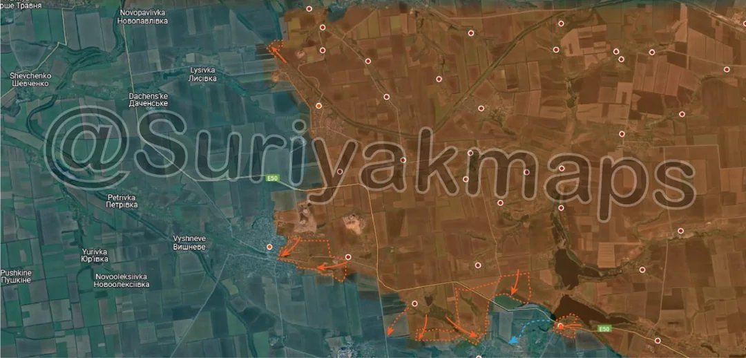 On the south side, as mentioned in my last update, Ukrainian troops in Karlivka were under threat of encirclement, and have been confirmed to have retreated further south to Halytsynivka today. Russia has advanced into Karlivka from the east, capturing the central part of the town as confirmed in this video. At the same time Russian assault groups continued advancing out of Memryk after capturing it last update, taking over a large portion of the fields and part of Halytsynivka, including the large trench network on the hill above the town. With Russian troops closing in from the northern heights, the remainder of Karlivka, and also Halytsynivka will fall under their control within the next day, as Ukrainian troops are simply unable to hold their positions.