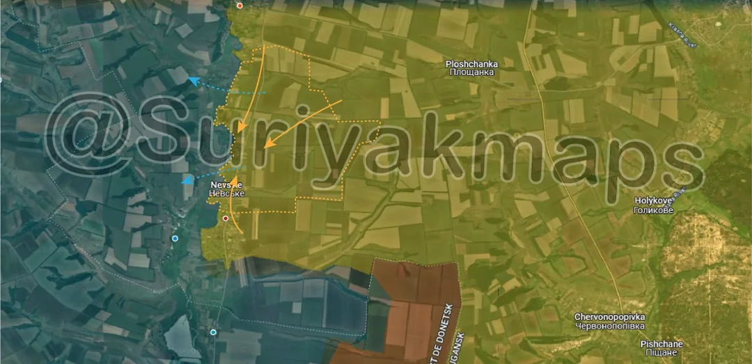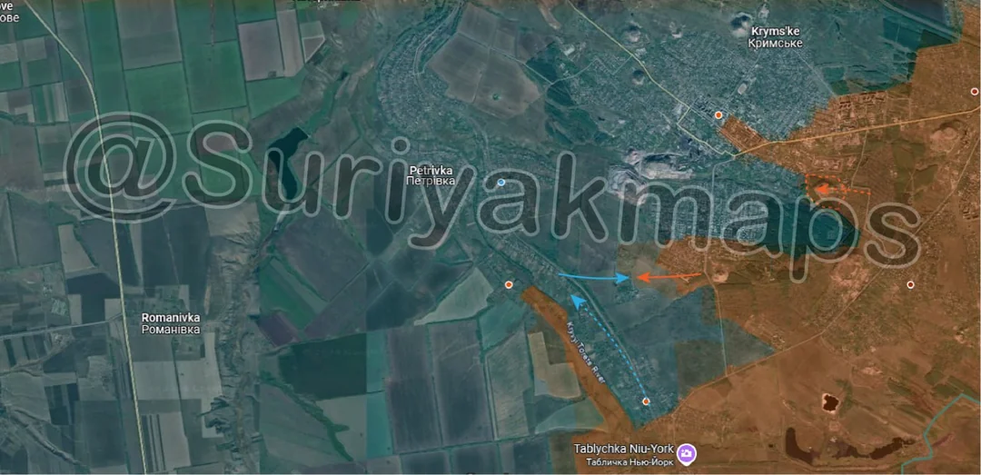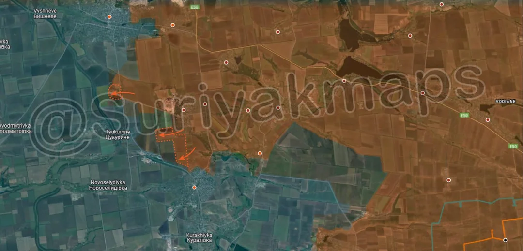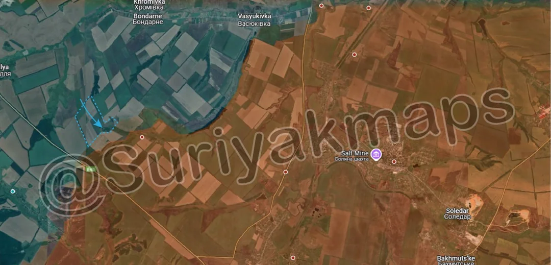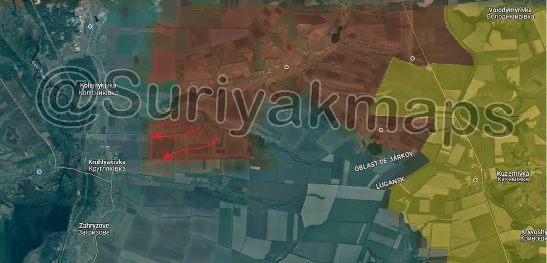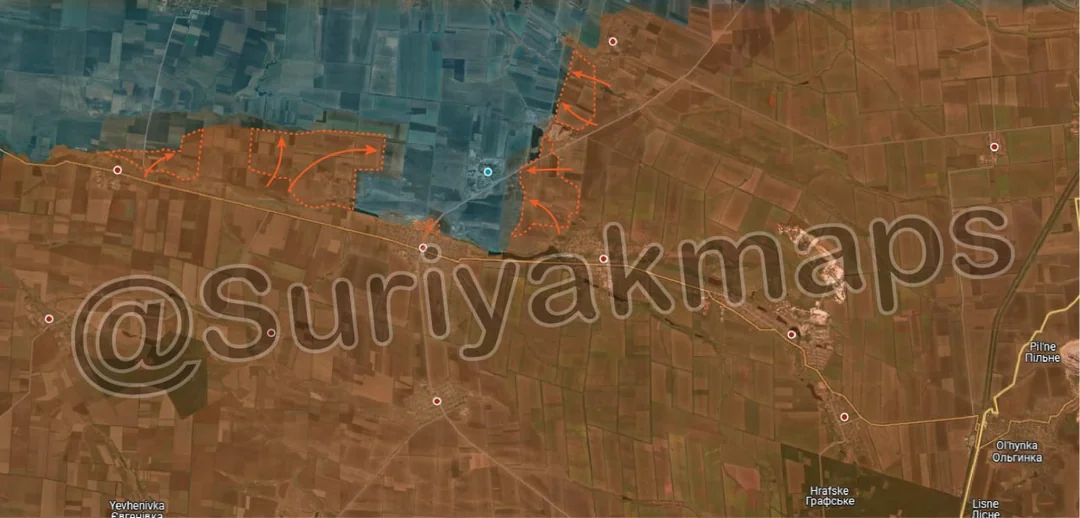On top of expanding their control of the fields north of Prechystivka (upper left red dot), Russian assault groups also cut northwest from their advances yesterday, using the exact same individual vehicle, small group tactics. This has allowed them to capture a large area of fields and several trenches quite quickly, as Ukrainian forces struggle with a lack of soldiers to properly man every position.